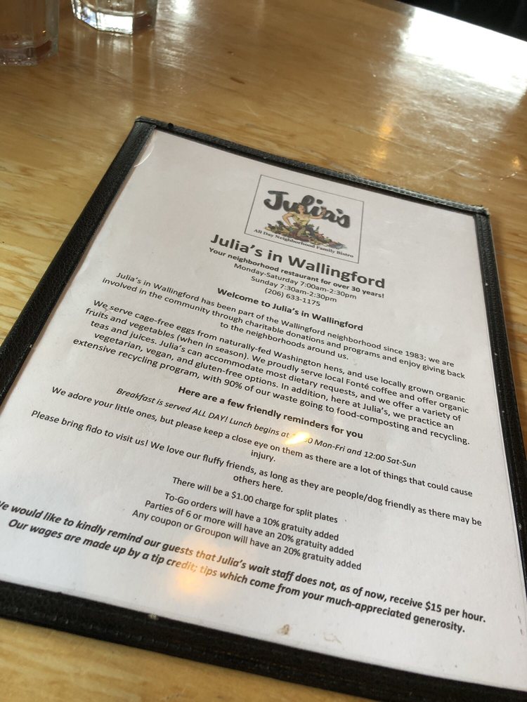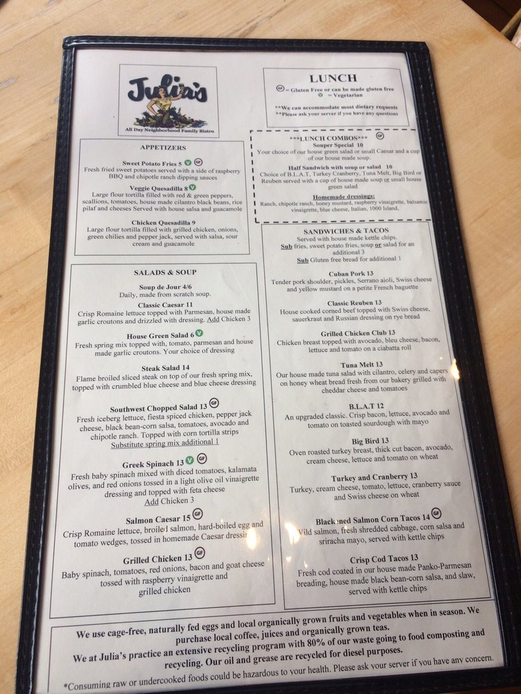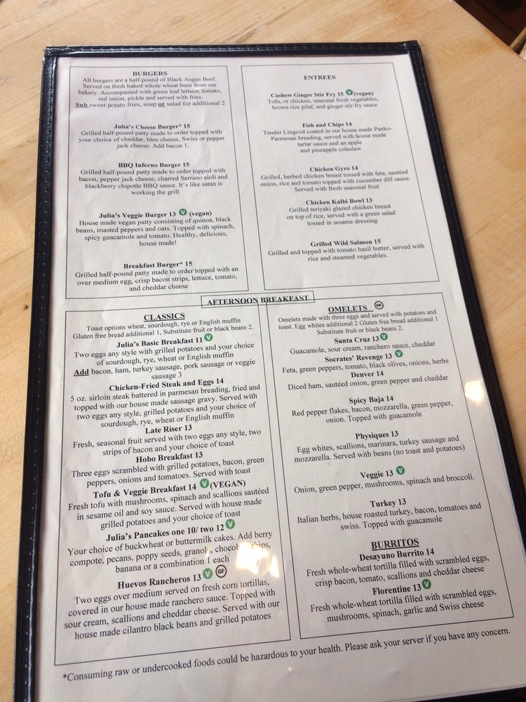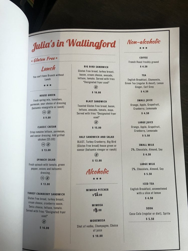 Located in Wallingford, Seattle, Julia's of Wallingford is a charming vegetarian-American restaurant known for its delicious breakfast and brunch options. They offer a wide array of menu choices, including classics like Chicken and Waffles, Huevos Rancheros, and Breakfast Tacos. The Breakfast Classics section features must-try dishes such as the Ham Benedict and the YumYum Combo. Customers praise the friendly service and cozy atmosphere, making them feel right at home. The extensive menu caters to both vegetarians and meat lovers, ensuring there is something for everyone. Reviewers highlight the generous portions and the quality of the food, with favorites like the vegetable skillet and the Mexican Breakfast receiving rave reviews. Despite some minor hiccups like communication among staff and high coffee prices, patrons agree that Julia's of Wallingford is a neighborhood gem worth visiting for a satisfying and filling breakfast experience.